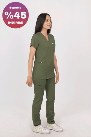SAFİR PREMIUM SCRUBS SERİSİ, kadın sağlık çalışanlarının gün boyu hareketli ve yoğun çalışma temposuna uyum sağlayacak şekilde tasarlanmıştır. Modern çizgileri, esnek kumaşı ve çok cepli yapısıyla hem şık bir görünüm sunar hem de fonksiyonel kullanım avantajı sağlar.